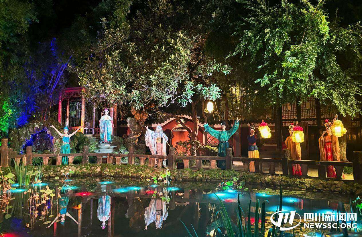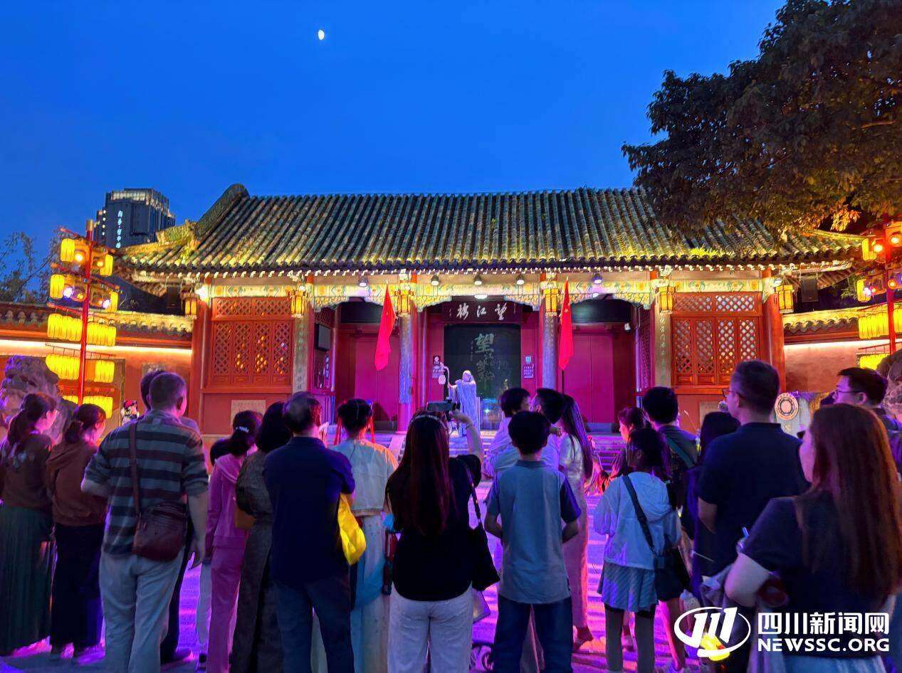 除了首展外,首演也深受市民游客追捧。国庆假期前夕,“望江梦华·薛涛吟”公园实景沉浸式夜游在位于武侯区的望江楼公园重磅首演。