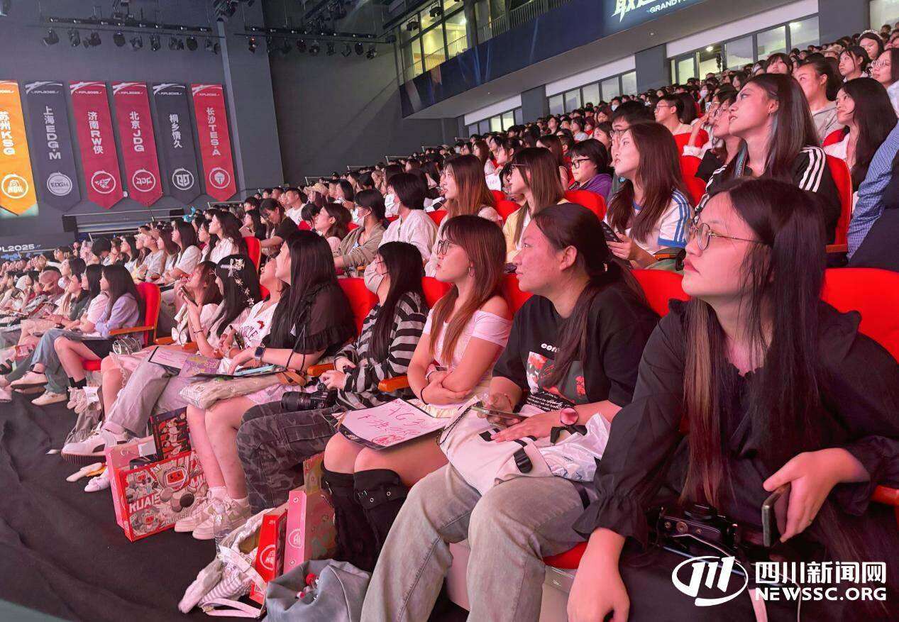 比赛正式开始前半小时,赛场外已人气十足。 观众专属打卡点、为战队助威的祝福留言区,以及精彩的粉丝互动环节接连上演,迅速点燃了现场气氛。来自重庆的帅女士和来自贵阳的刘女士,因游戏结缘,组队提前1小时来到赛场,“有观众和选手互动的环节,想站前排一点,多拍点照片。”她们还计划看完比赛,在成都过个小假期,好好感受这座城市的魅力。