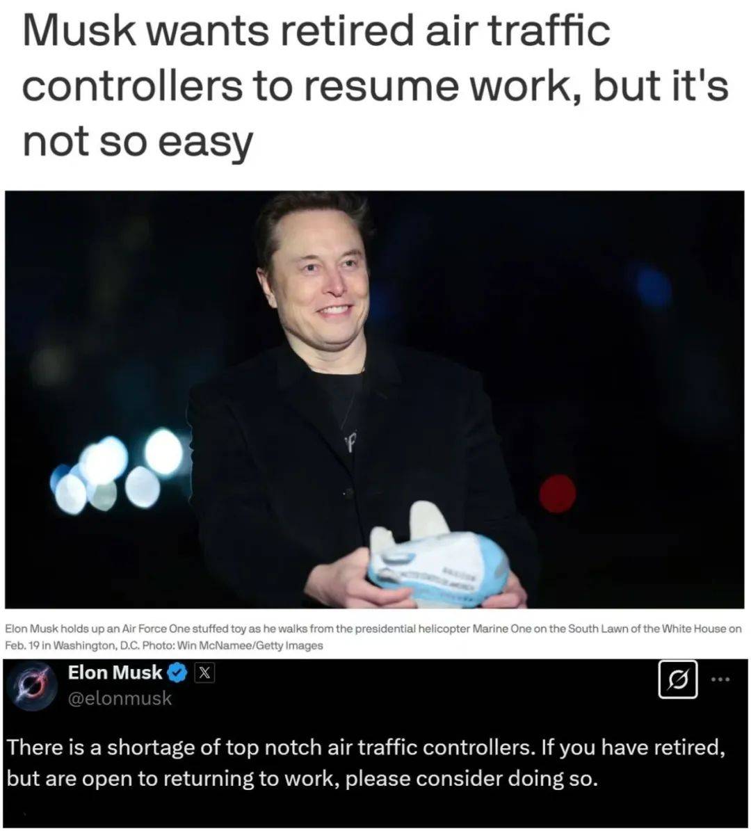 忙着“裁人”的马斯克竟呼吁“返聘”。美国阿克西奥斯新闻网27日报道称,近期领导美国“政府效率部”对多个部门进行大刀阔斧裁员的马斯克当天竟意外地发出了“招人”的信号,他当天呼吁退休的空中交通管制员在当前人员短缺的情况下考虑重返工作岗位。