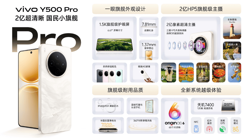 AG娱乐,AG真人,AG平台,AG旗舰厅,AG视讯,AG娱乐平台,真人视讯平台,首存送彩金2025年11月10日,vivo正式发布vivo Y500 Pro。作为Y系列的新一代产品,vivo Y500 Pro在影像、设计、系统、耐用和续航等方面全面升级,配备2亿HP5旗舰级主摄、7000mAh半固态蓝海电池、6.67英寸1.5K旗舰级护眼屏和OriginOS 6系统,定位“国民小旗舰”。