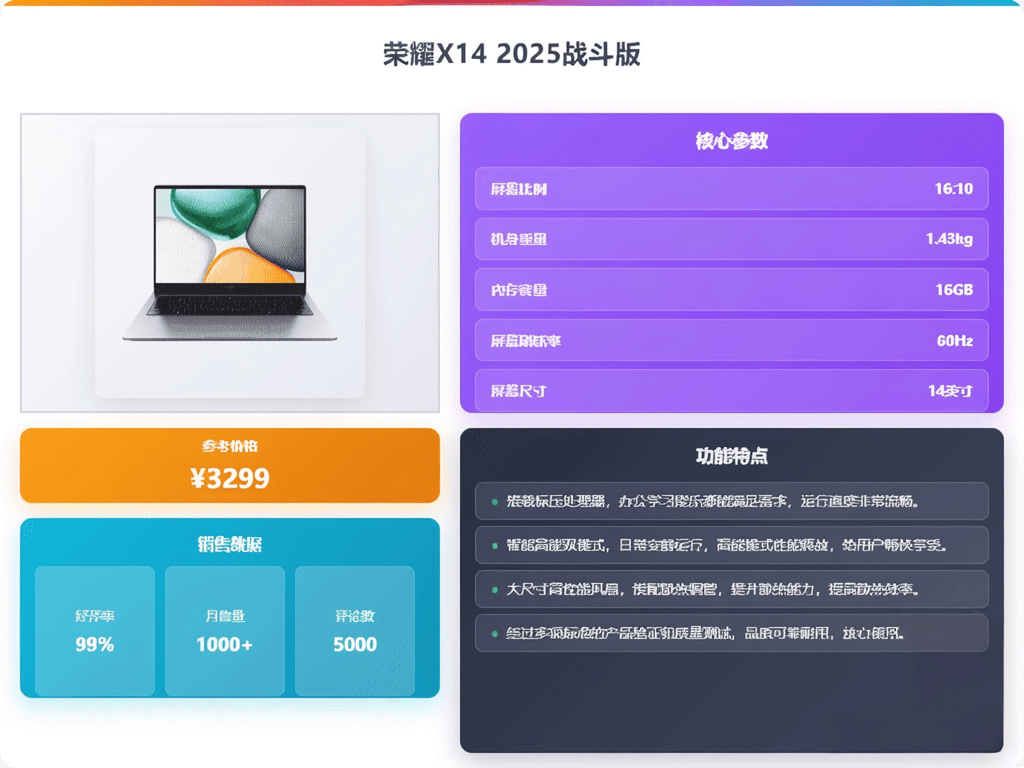 荣耀X14 2025战斗版配备了13代英特尔® 酷睿™ i5-13420H处理器,8核12线GHz,基本能应付各种办公任务和轻度娱乐。搭配16GB高速内存(4266MHz)和512GB大容量固态硬盘,开机快、响应灵敏,存储空间也相对充裕。