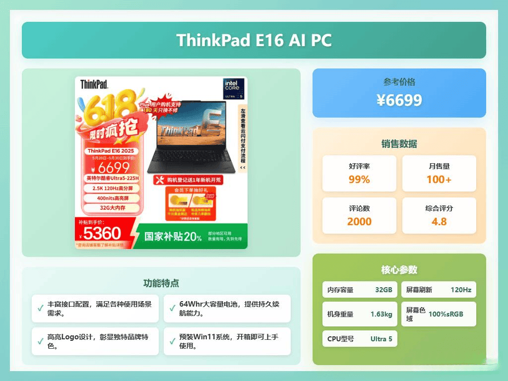 ThinkPad E16 AI PC配备了一块16英寸的2.5K高分辨率IPS屏幕,色域覆盖100%sRGB,显示效果相当细腻,色彩也非常丰富。120Hz的刷新率让画面流畅度提升不少,尤其是在浏览网页或多任务切换时,画面更顺滑,减少拖影体验。屏幕还支持低蓝光Eyesafe认证,有效减少眼睛疲劳。