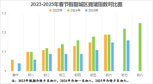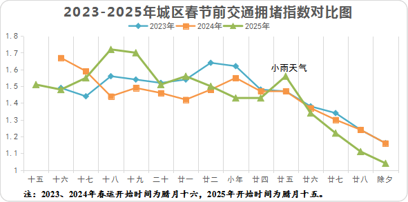 受学校放假、提前返乡等因素影响,近年春节前城区交通运行规律总体为:春运开始至小年前一天城市交通整体呈中低位运行,小年至除夕前一天城区机动车出行量及拥堵程度持续降低,城市交通处于畅通状态。